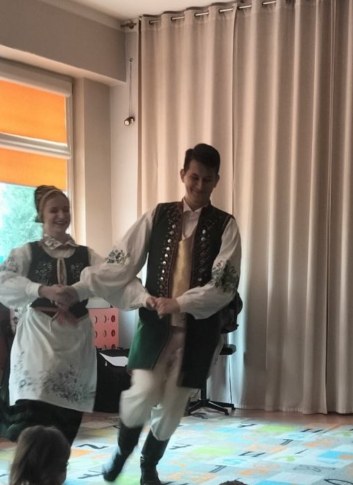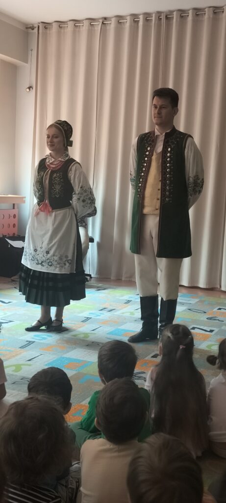 Dzisiaj podczas koncertu edukacyjnego przenieśliśmy się do niezwykle urokliwych Kaszub, poznając dawne zwyczaje i tradycje ich mieszkańców. Ogromne wrażenie zrobił na dzieciach regionalny strój kaszubski ozdobiony przepięknym kwiatowym haftem. Nie zabrakło oczywiście tradycyjnych tańców takich jak: Mareszka, Koseder i Dzek, których rytmy szybko porwały dzieci do wspólnego tańca.