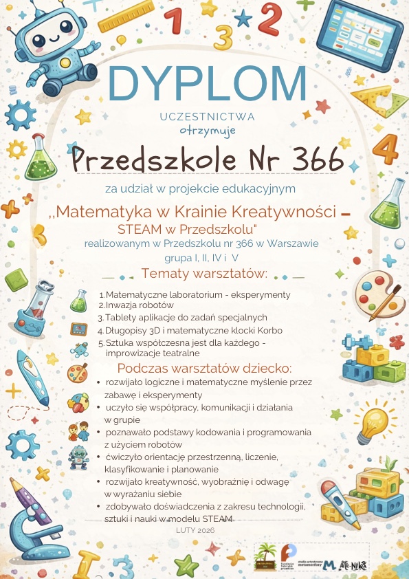 Z radością informujemy, że w naszym przedszkolu zakończyliśmy realizację innowacyjnego projektu edukacyjnego „Matematyka w Krainie Kreatywności – STEAM w Przedszkolu”. Projekt, przygotowany we współpracy z Fundacją Fabryka Przemian, miał na celu rozwijanie u dzieci kompetencji matematycznych poprzez działania inspirowane koncepcją STEAM, łącząc naukę, technologię, inżynierię, sztukę i matematykę.
