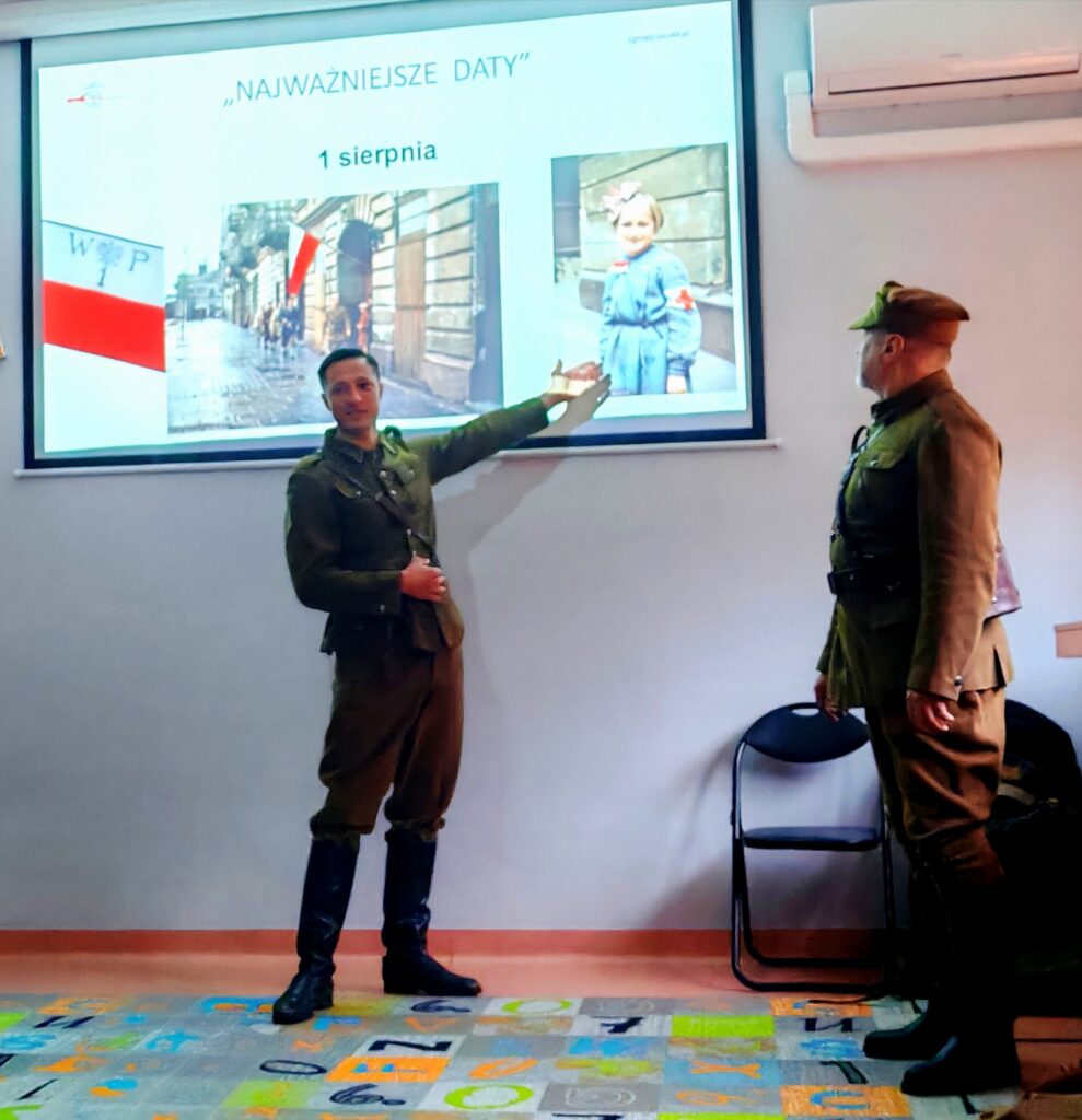 W piątek i w poniedziałek nasze przedszkole odwiedzili członkowie ze Stowarzyszenia Grupa Historyczna „ Zgrupowanie Radosław”. Dzieci z ciekawością słuchały opowieści o historii Polski, przymierzały prawdziwy hełm, a na koniec wspólnie salutowały. To była piękna lekcja patriotyzmu!